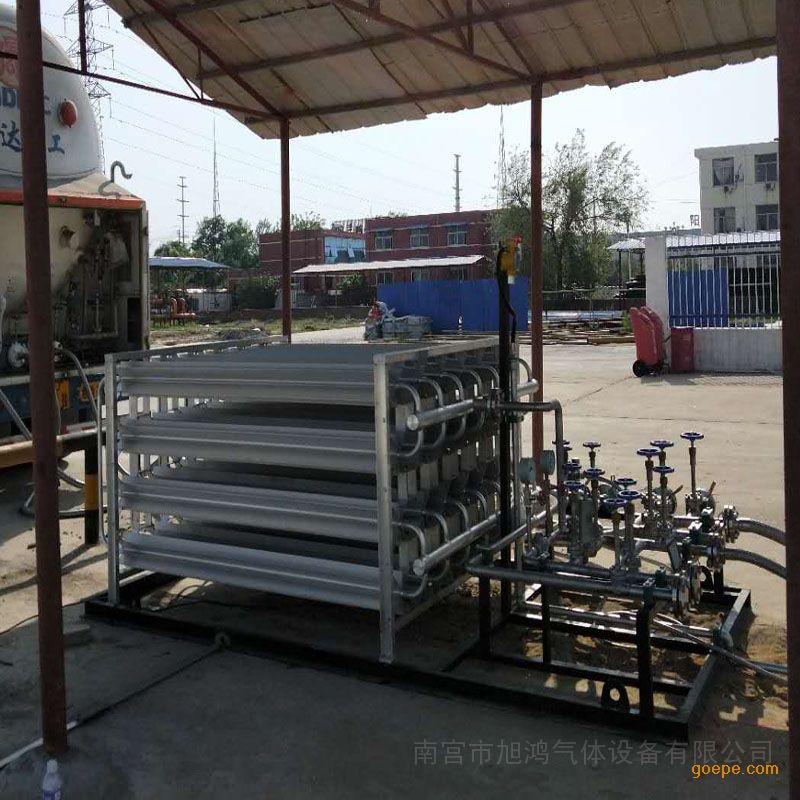 由于LNG槽车自身不带增压系统,所以卸车过程需要将车内液体LNG经气化后返回槽车内,通过气体增压,来实现卸车功能,这个撬装系统叫做卸车增压系统。卸车增压系统将槽车的压力提高至工作状态的0.6MPa,使槽车内液体在压力作用下流入储罐,一般需要300m3/h型号的空温汽化器。